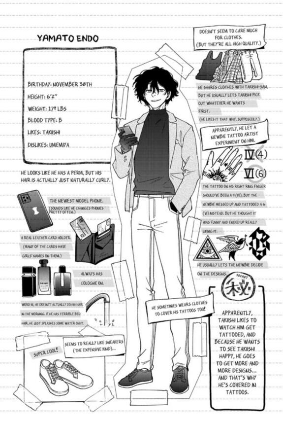 they met as kids and have been friends (?) ever since. Noriaki is the only one besides Takiishi that Endo doesn't find boring. he also drew most of Endo's tattoos. when it was time to go to highschool, due to being trans, Noriaki had to go to a co-ed school while Endo went to Furin. they spent a year without much contact until Endo tracked him down and they reconnected/began dating (?). Noriaki wasn't aware, but Endo relentlessly stalked him prior to this, stealing his things and following his movements. upon discovering this, he doesn't seem bothered about it.Chika Takiishi